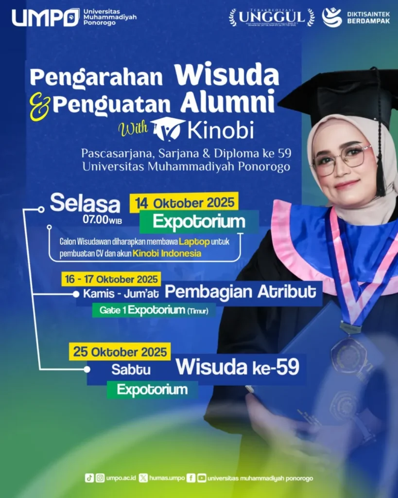 Universitas Muhammadiyah Ponorogo akan menggelar kegiatan pengarahan sekaligus penguatan alumni bersama Kinobi Indonesia, sebuah platform pengembangan karier yang membantu mahasiswa menyiapkan diri memasuki dunia kerja profesional. 💼✨