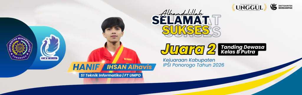 FTUMPO – Fakultas Teknik Universitas Muhammadiyah Ponorogo (UMPO) kembali menorehkan prestasi membanggakan melalui bidang non-akademik. Mahasiswa program studi S1 Teknik Informatika, Hanif Ihsan Alhavis, berhasil meraih Juara 2 Tanding Dewasa Kelas B Putra dalam Kejuaraan Kabupaten yang diselenggarakan oleh IPSI Ponorogo Tahun 2026.